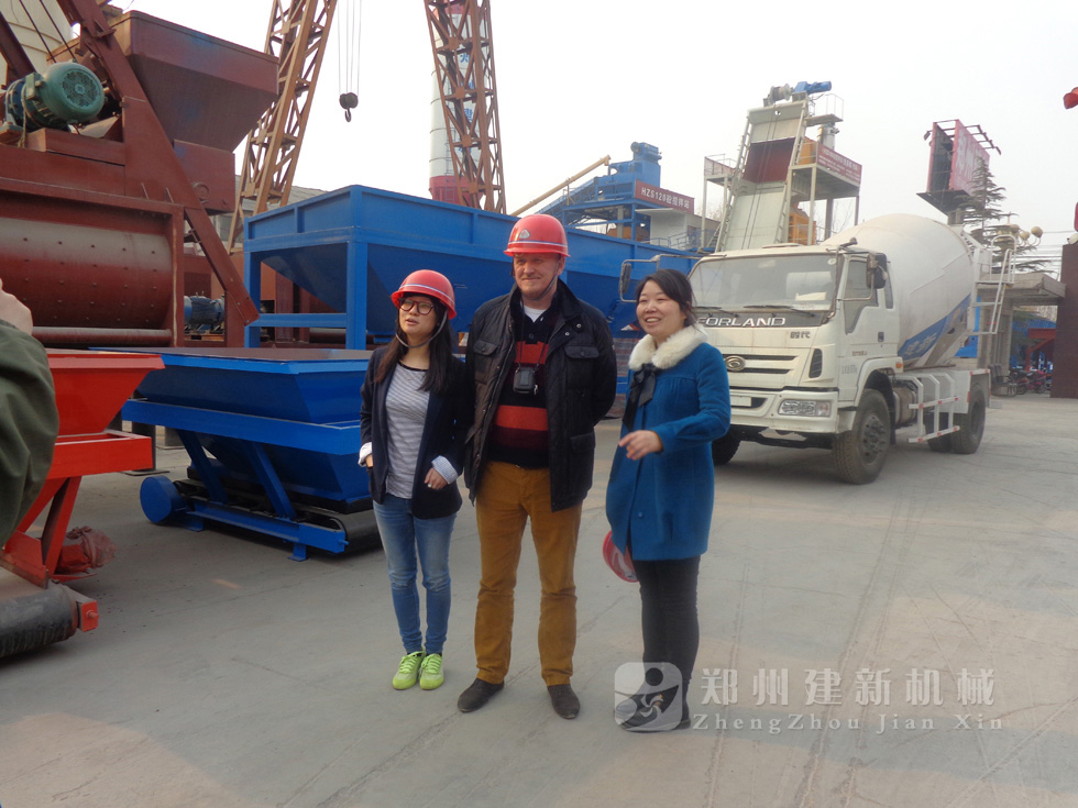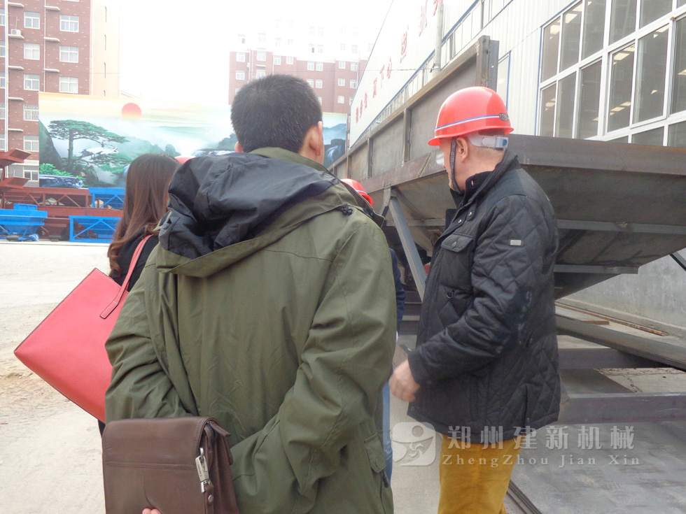 2014年11月,来自俄罗斯的客户来到郑州建新公司签订了两套时产120方混凝土搅拌站设备的大订单,下图为建新公司销售部刘经理、经理带客户参观建新公司的生产车间及成品货场。